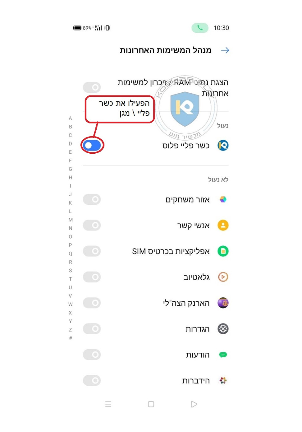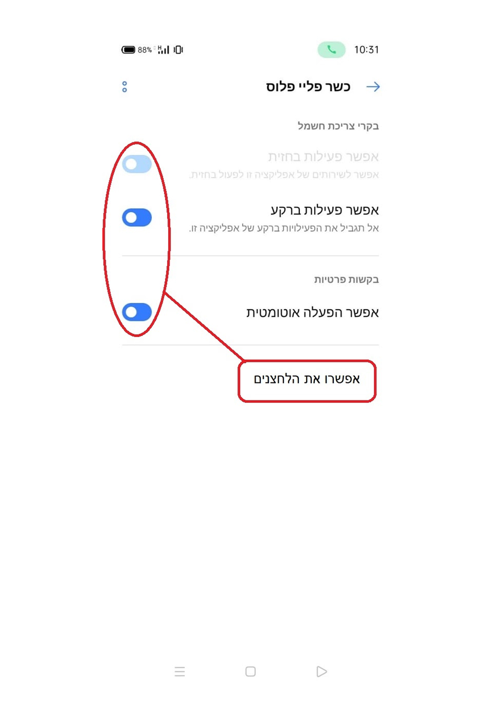 חזור למסך הראשי של המכשיר ולחץ לחיצה ארוכה על כשר פליי\מגן לחץ על פרטי אפליקציה ואפשר את הלחצנים
